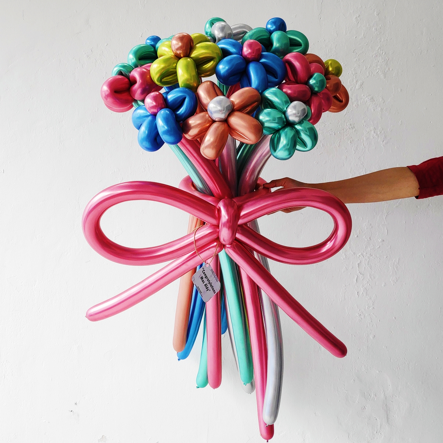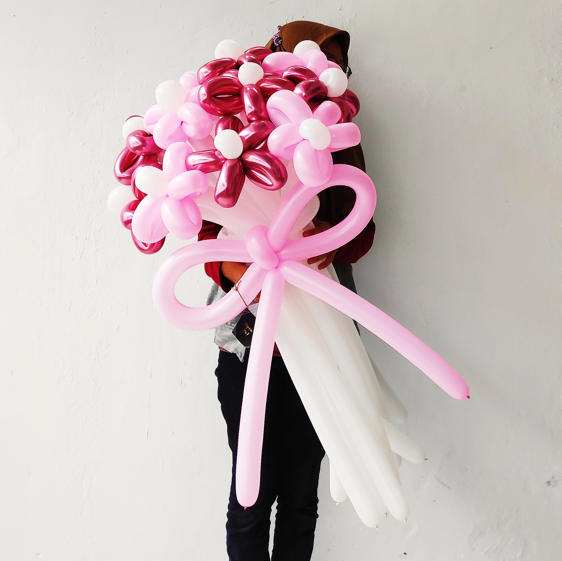 Balon yang dibentuk seperti bunga dan batang, sudah disertai pita