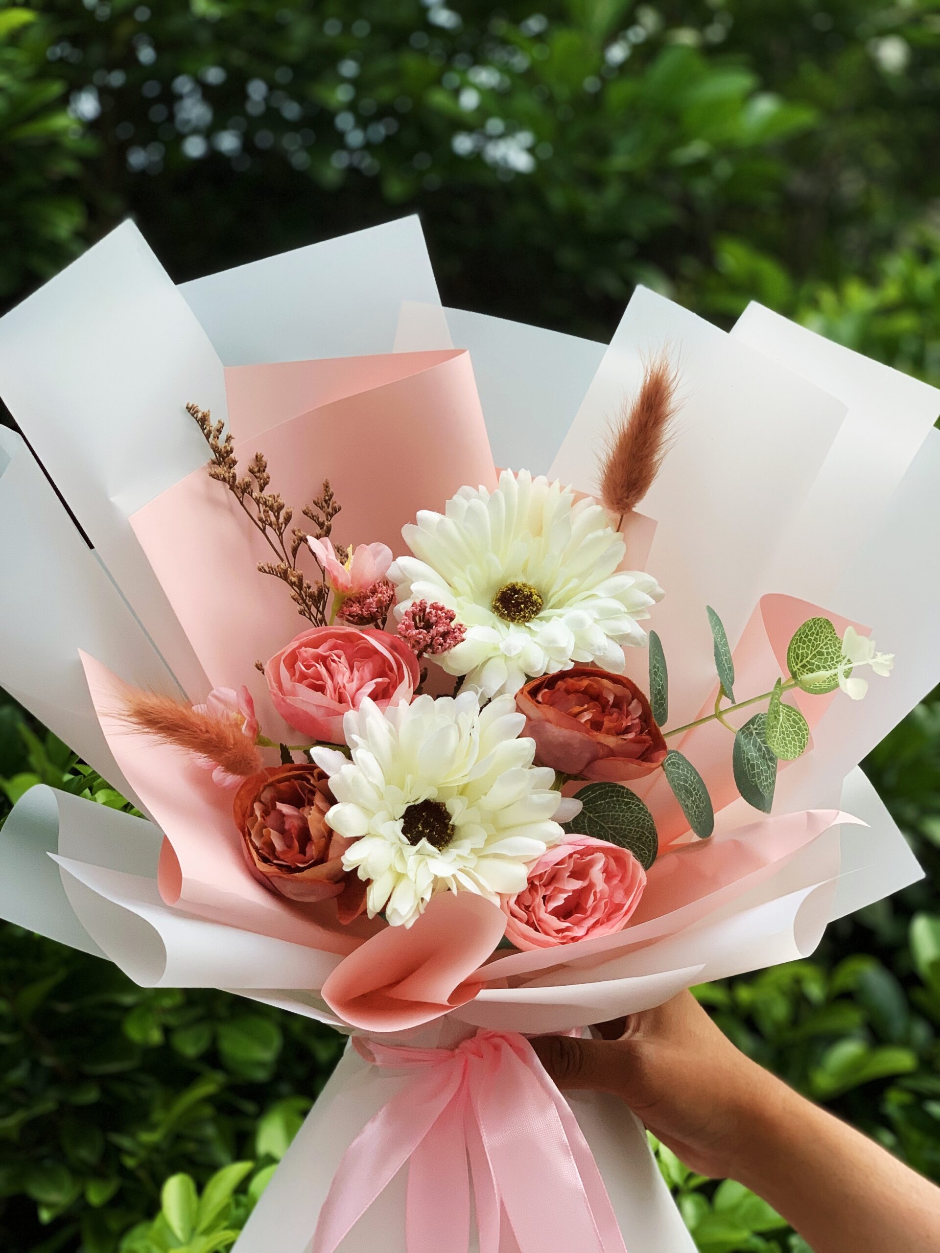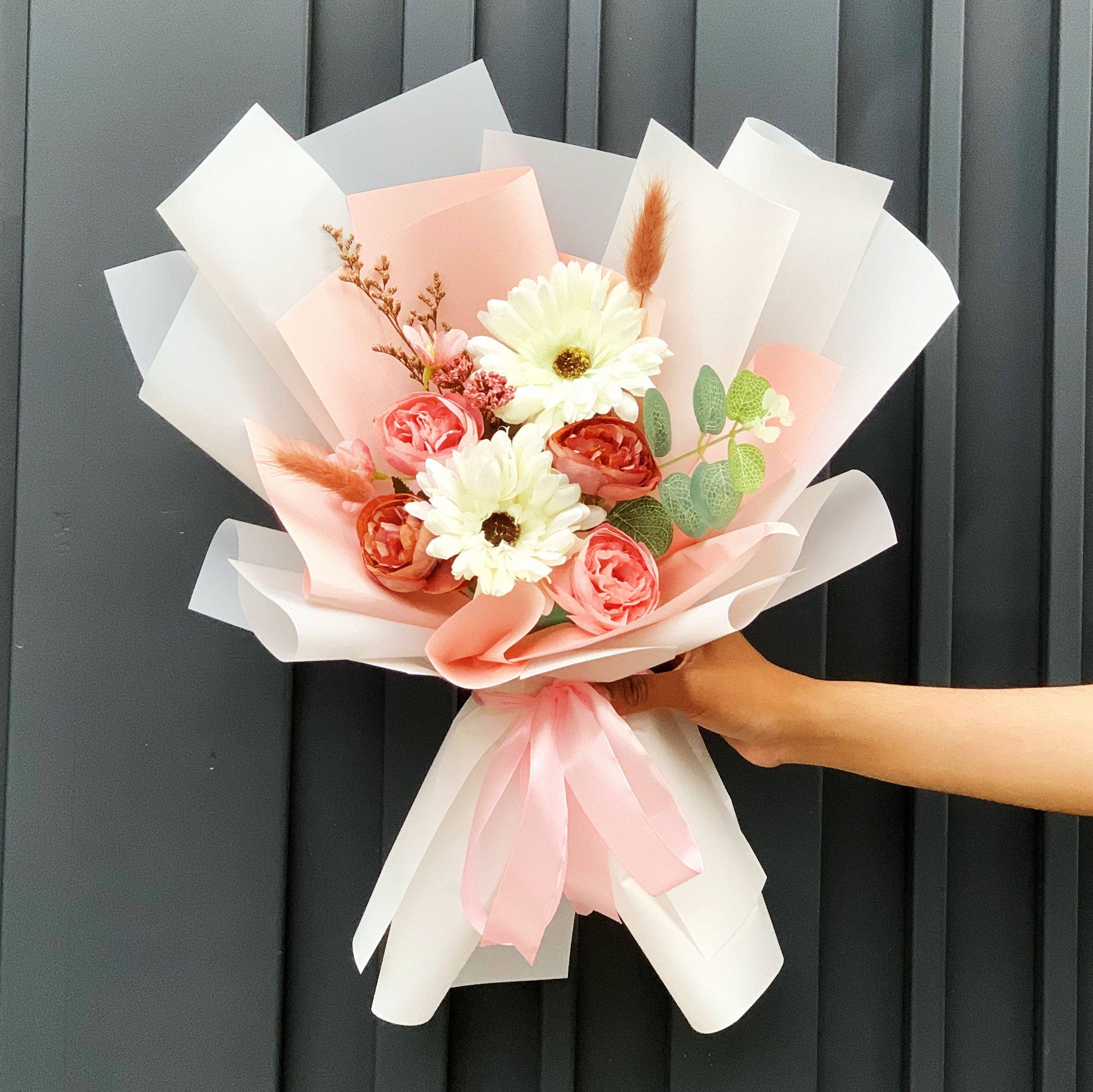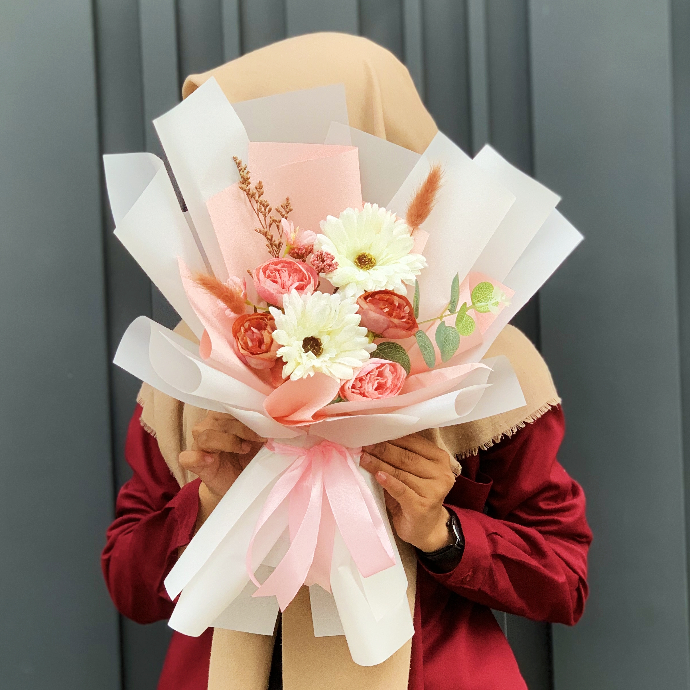 Gendari digambarkan sebagai sosok yang anggun dan mempesona. Sebuah bouquet dengan artificial gerbera yang dikemas dalam gaya wrapping modern biasanya menampilkan kombinasi elegan antara kesan alami bunga-bunga dengan estetika kontemporer.