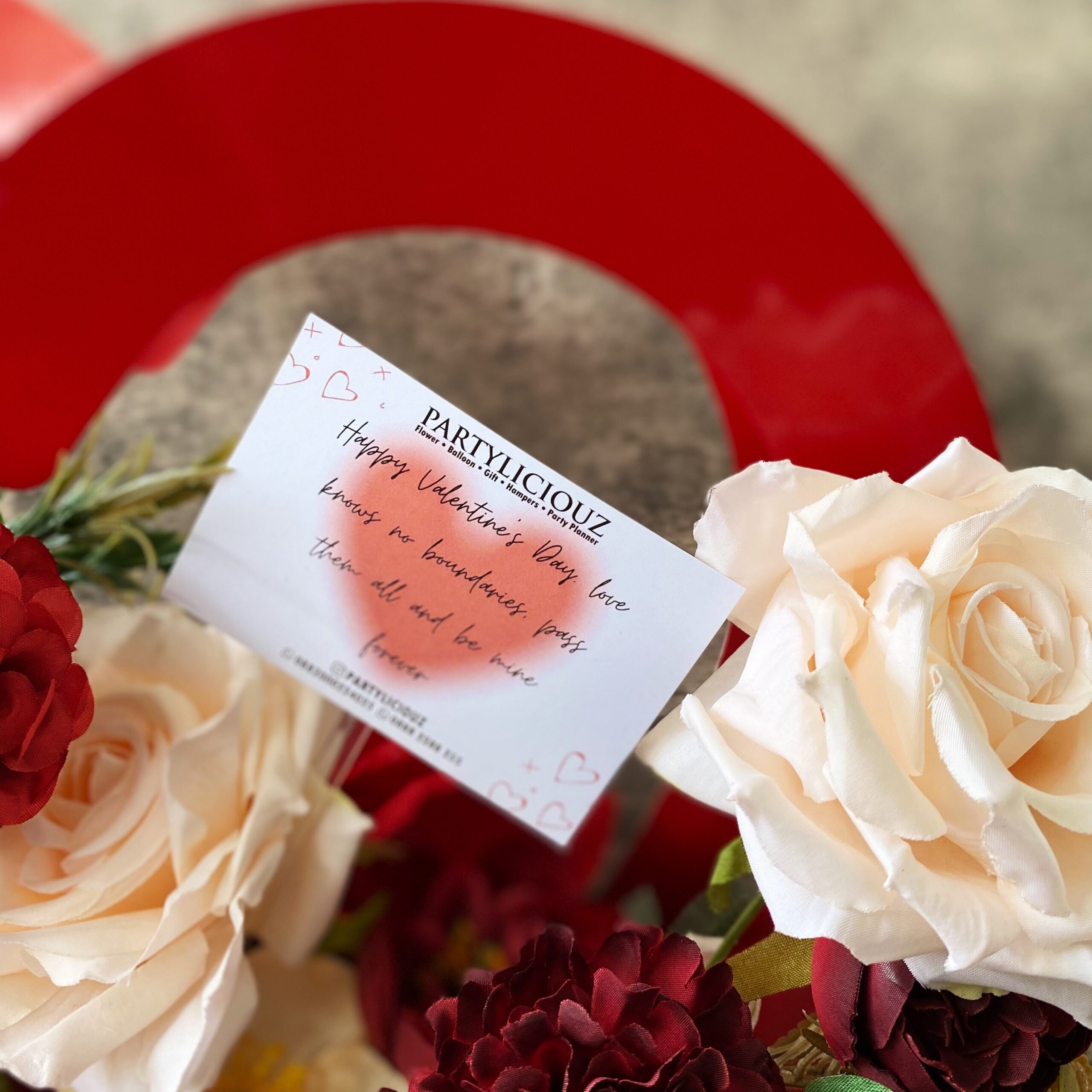 Setiap  detail dalam box,menggambarkan cinta sejati. Bunga artificial yang anggun hingga wishcard yang penuh perasaan.