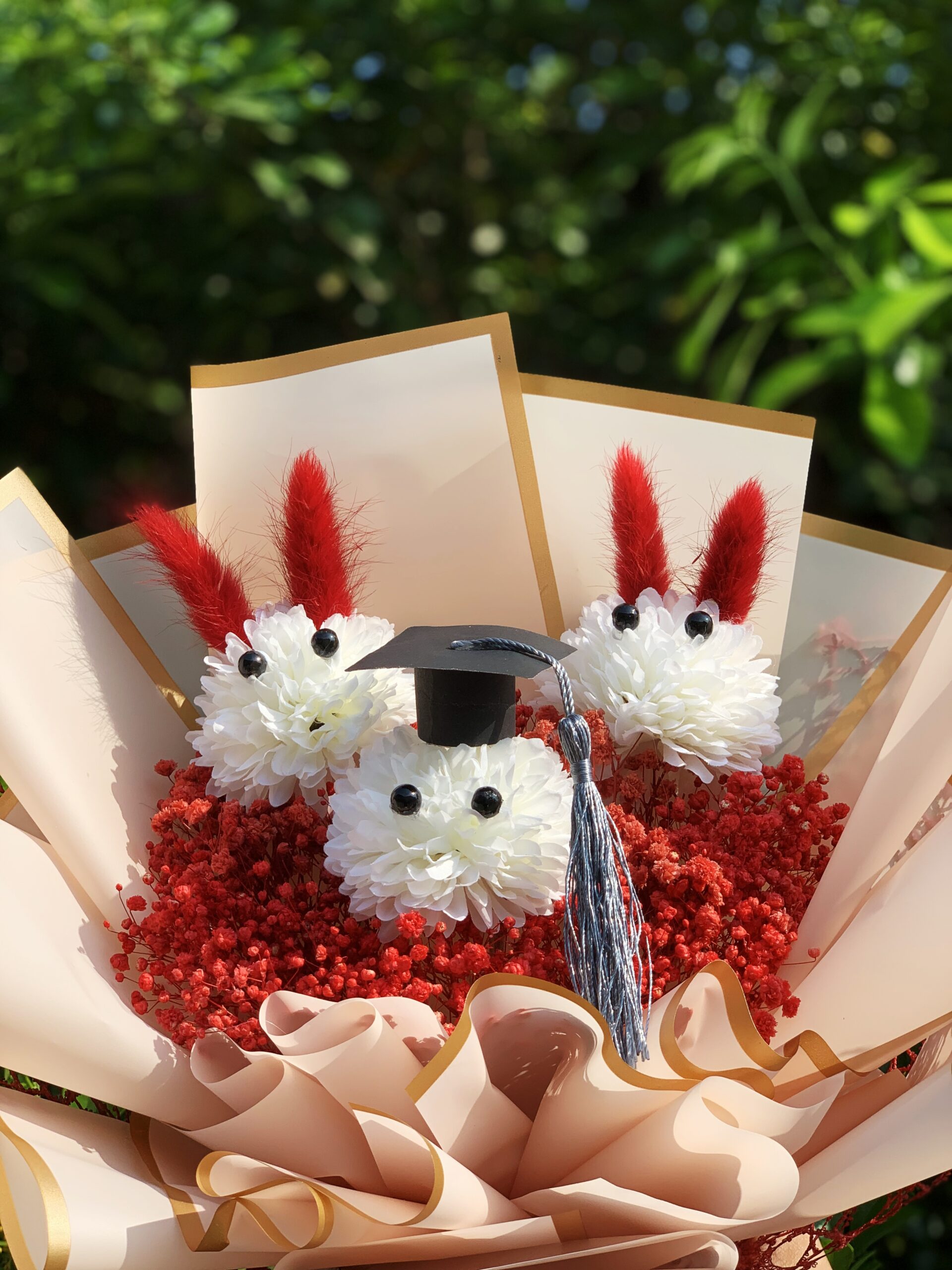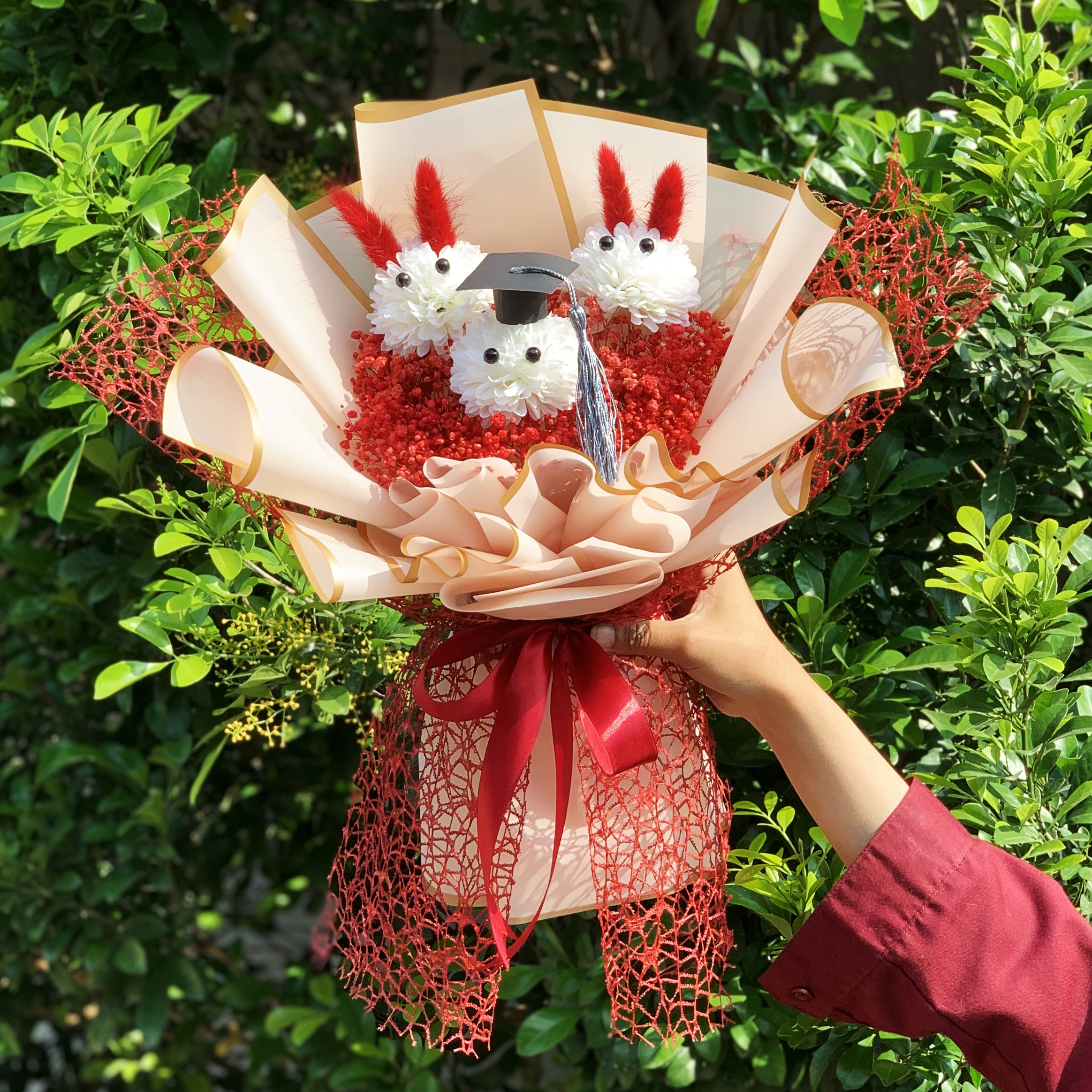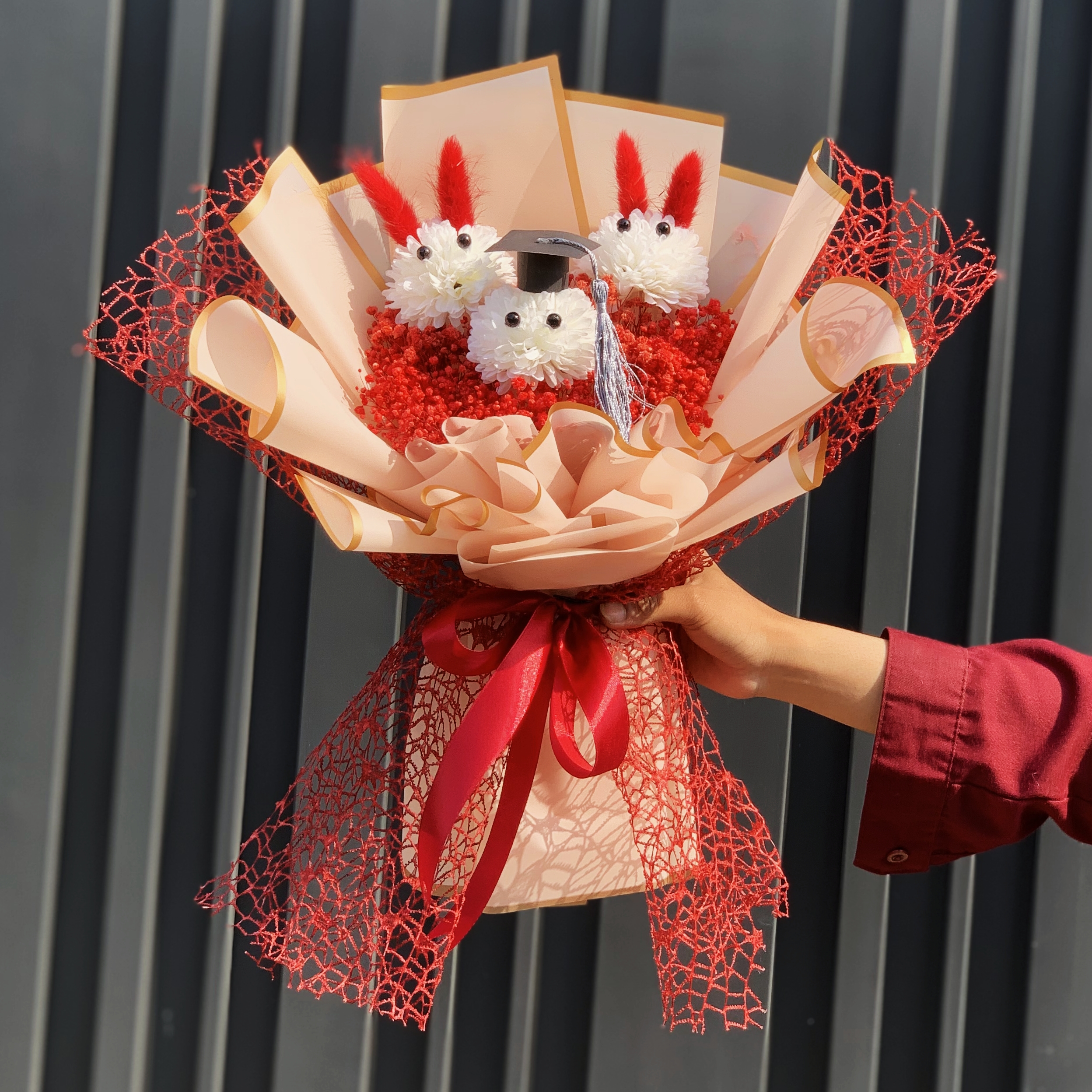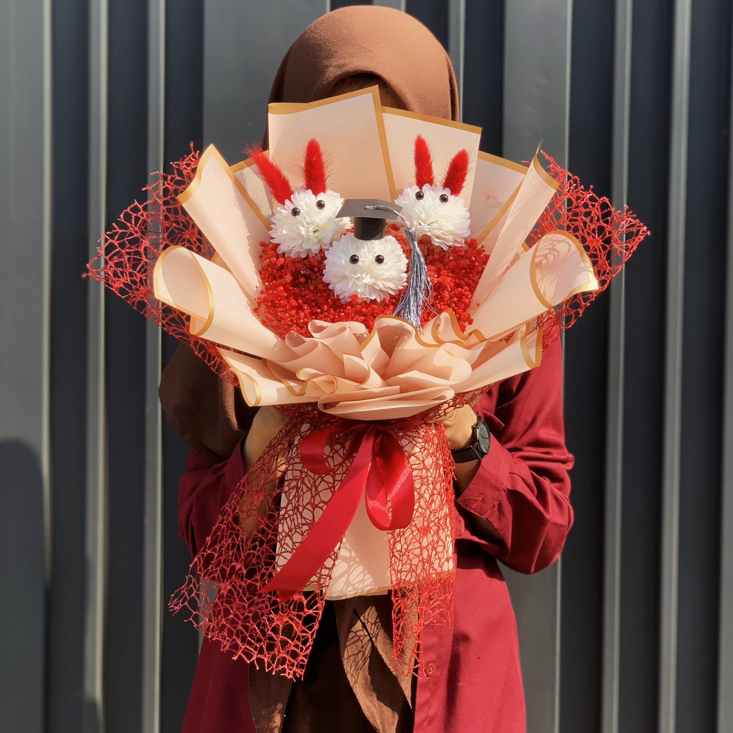 Rukmini digambarkan dengan sifat setia dan penyayang. Buket bunga yang menggabungkan keanggunan baby breath kering dan kelembutan karakter pompom, menambahkan sentuhan elegan dan modern.